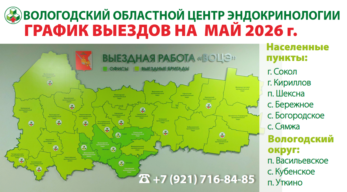 Выезды бригады Вологодского Областного Центра Эндокринологии в населенные пункты Вологодской области в МАЕ 2026 года:
