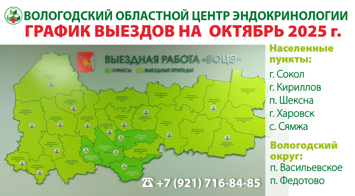 Выезды бригады Вологодского Областного Центра Эндокринологии в населенные пункты Вологодской области в СЕНТЯБРЕ 2025 года: