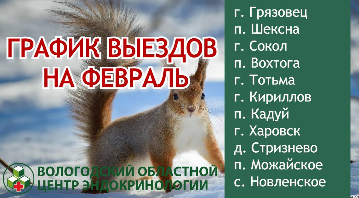 Выезды бригады Вологодского Областного Центра Эндокринологии в населенные пункты Вологодской области в ФЕВРАЛЕ 2024 года: