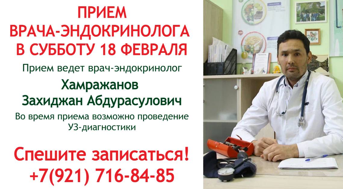В СУББОТУ 18 февраля, проведет прием врач-эндокринолог Хамражанов Захиджан Абдурасулович.